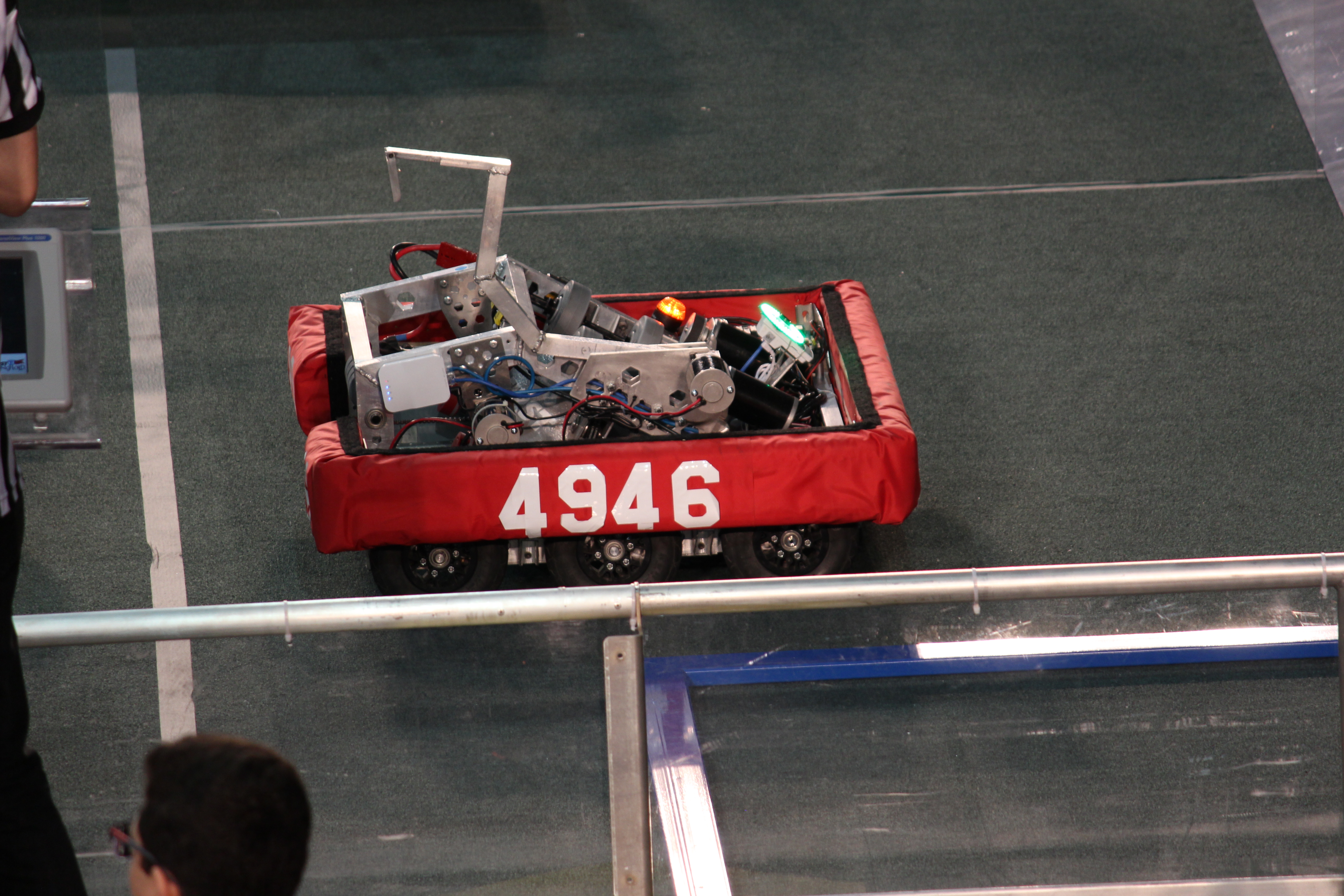 The team’s robot for that season was named Sir Cyr, after a graduating student from the 2015 Recycle Rush season. The robot used a pneumatic wheel West Coast Drive to defeat the terrain based defenses, and had an arm to overcome defenses that needed to be interacted with. The robot could score in both the low and high goals, using vision to align with the high goal.